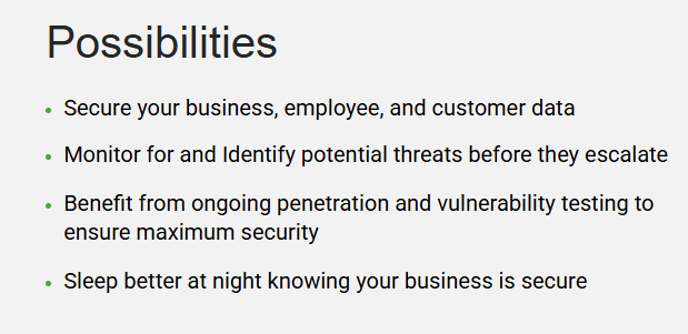 We conduct regular vulnerability and penetration testing, perform security scans routinely and take care of other security management functions for your organization, as well as deliver security awareness training to you and your staff, your biggest security vulnerability.